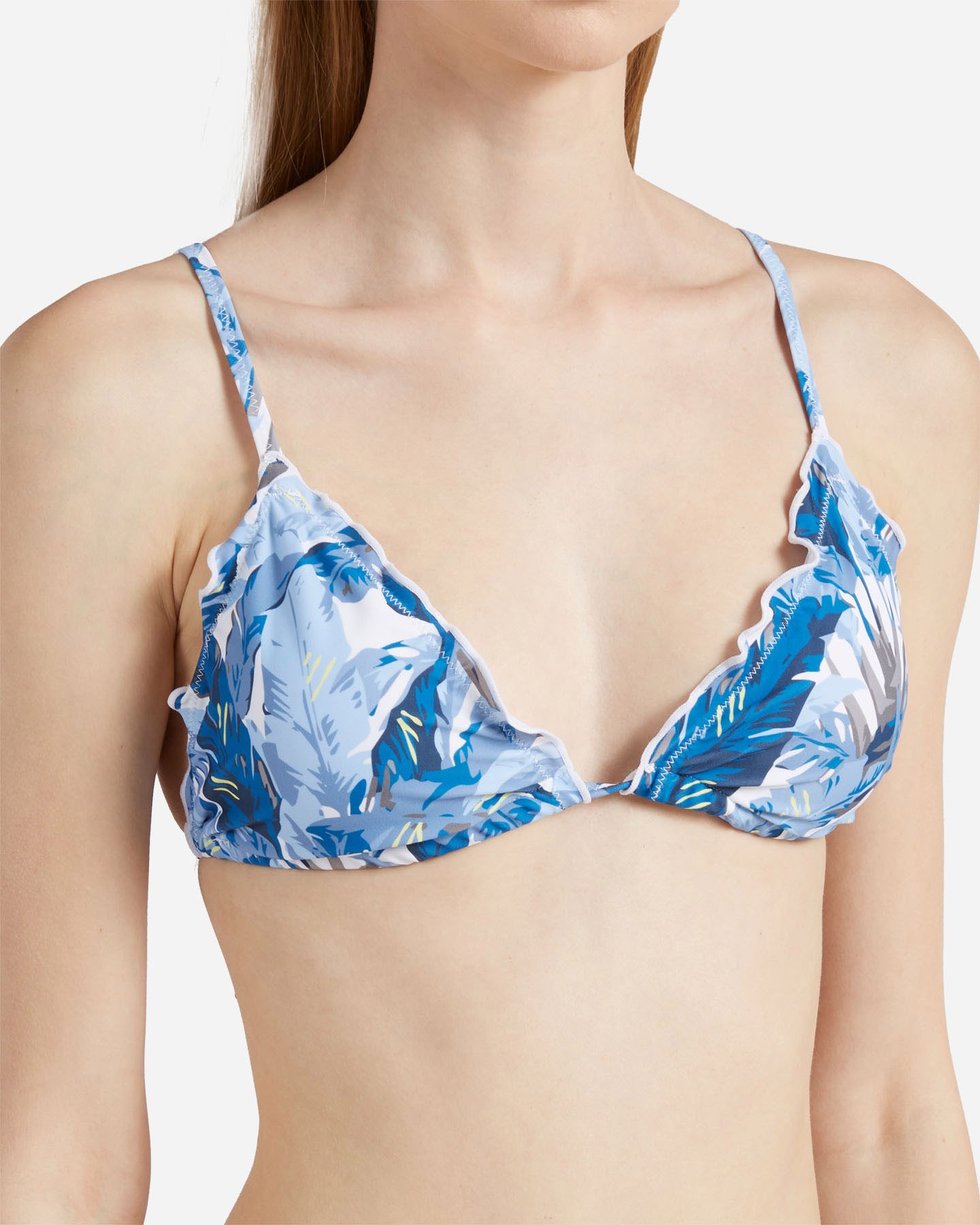 Questo bikini a triangolo presenta una fantasia foliage, ed una chiusura con fiocchi laterali sullo slip, pratico per essere indossato nelle tue giornate al mare.