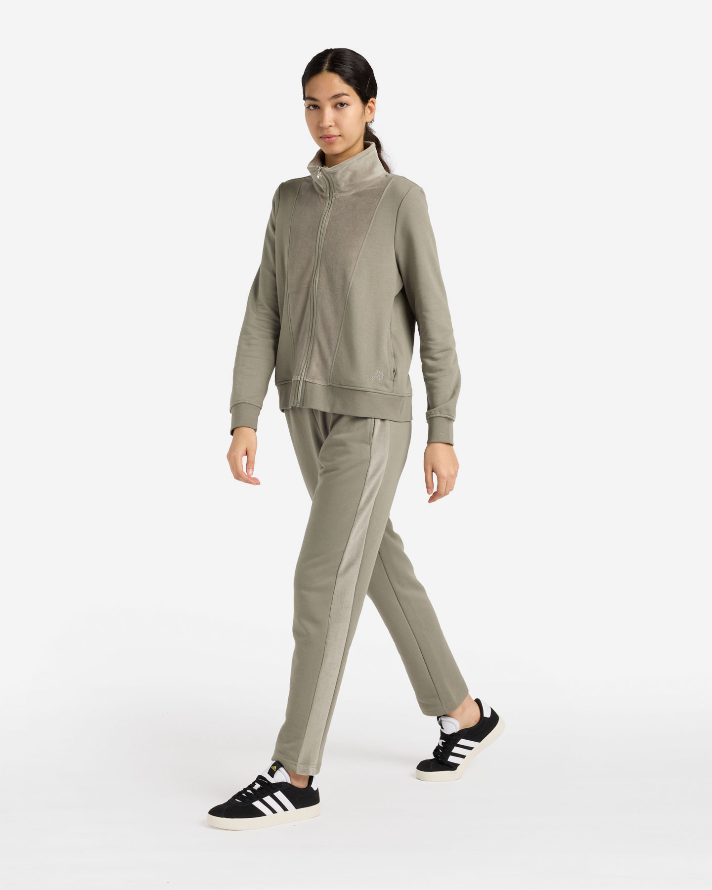 Questa felpa garzata full zip, presenta inserti e collo in morbida ciniglia di cotone. Il fondo e le maniche hanno un polsino lavorato in costina, e tasche inserite nel fianco. Il tirazip è strass e zip in metallo. Il logo del brand stampato dietro, è ricamato corsivato del brand sul davanti a sinistra.