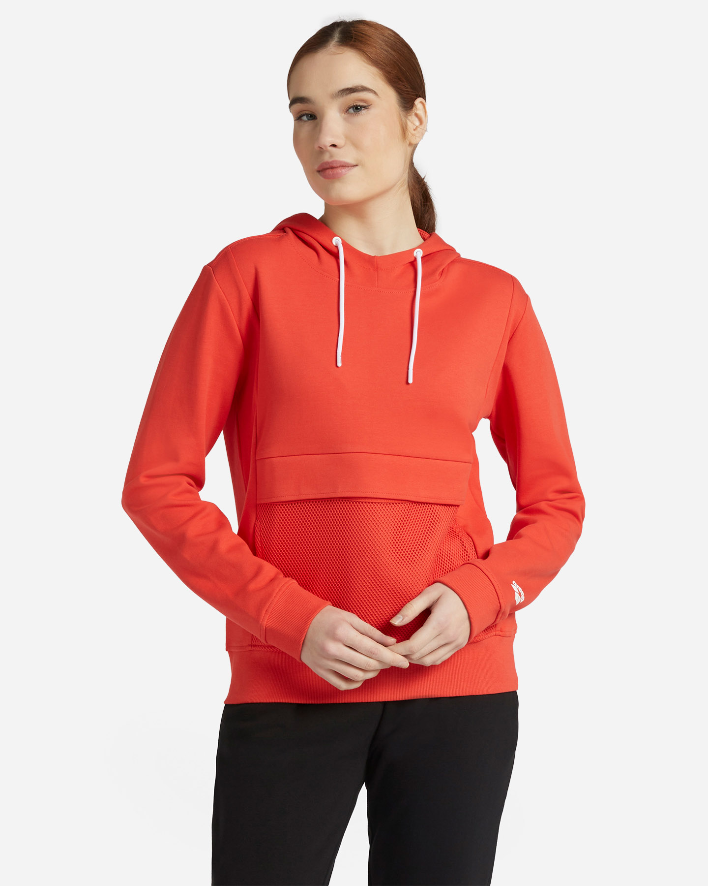 Felpa tecnica chiusa con mesh interna al cappuccio e sopra alla tasca a marsupio.