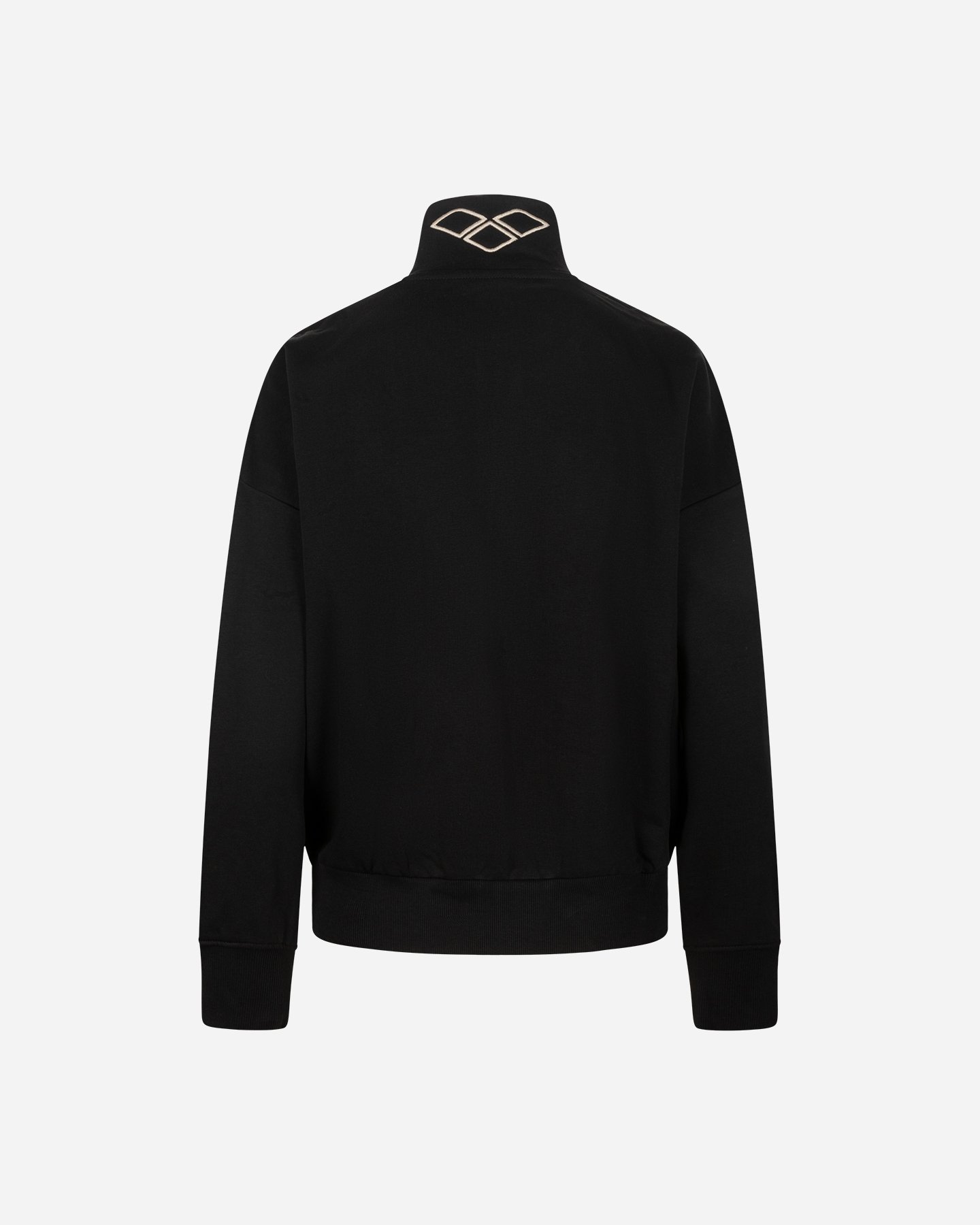 Questa felpa con collo tracktop, presenta il fondo corpo, e manica con rifinitura in costina. Le tasche laterali sono inserite nel fianco. Il ricamo outline nella parte dietro, è visibile sul collo, mentre il logo del brand sull'etichetta jaquard, è inserita nel polsino della manica sinistra.