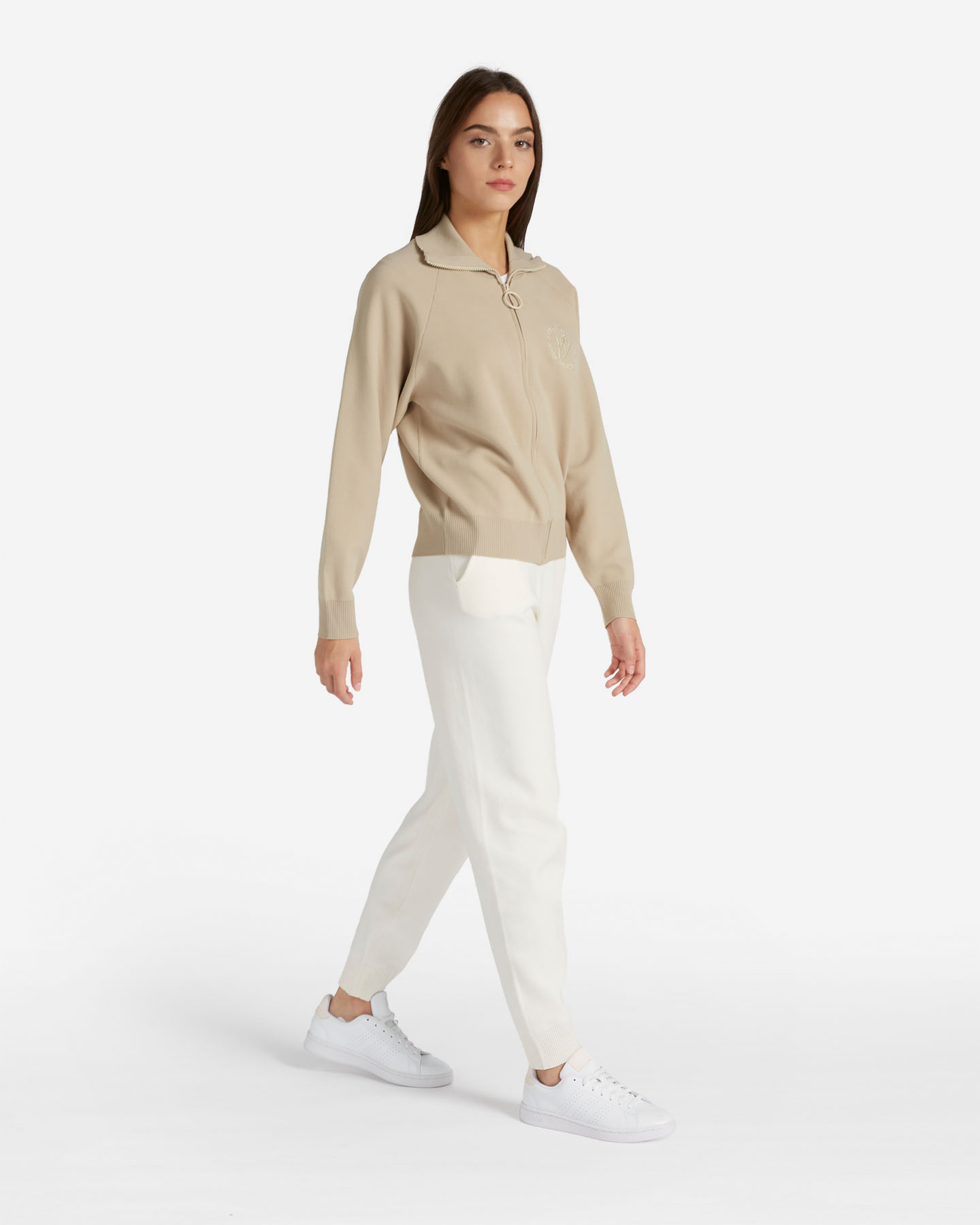 Pullover full zip a collo alto in maglia, lavorata a punto milano con ricamo su cuore. Il ricamo raffigura uno sciatore in volo che rimanda al tema della collezione che si ispira agli sport invernali.