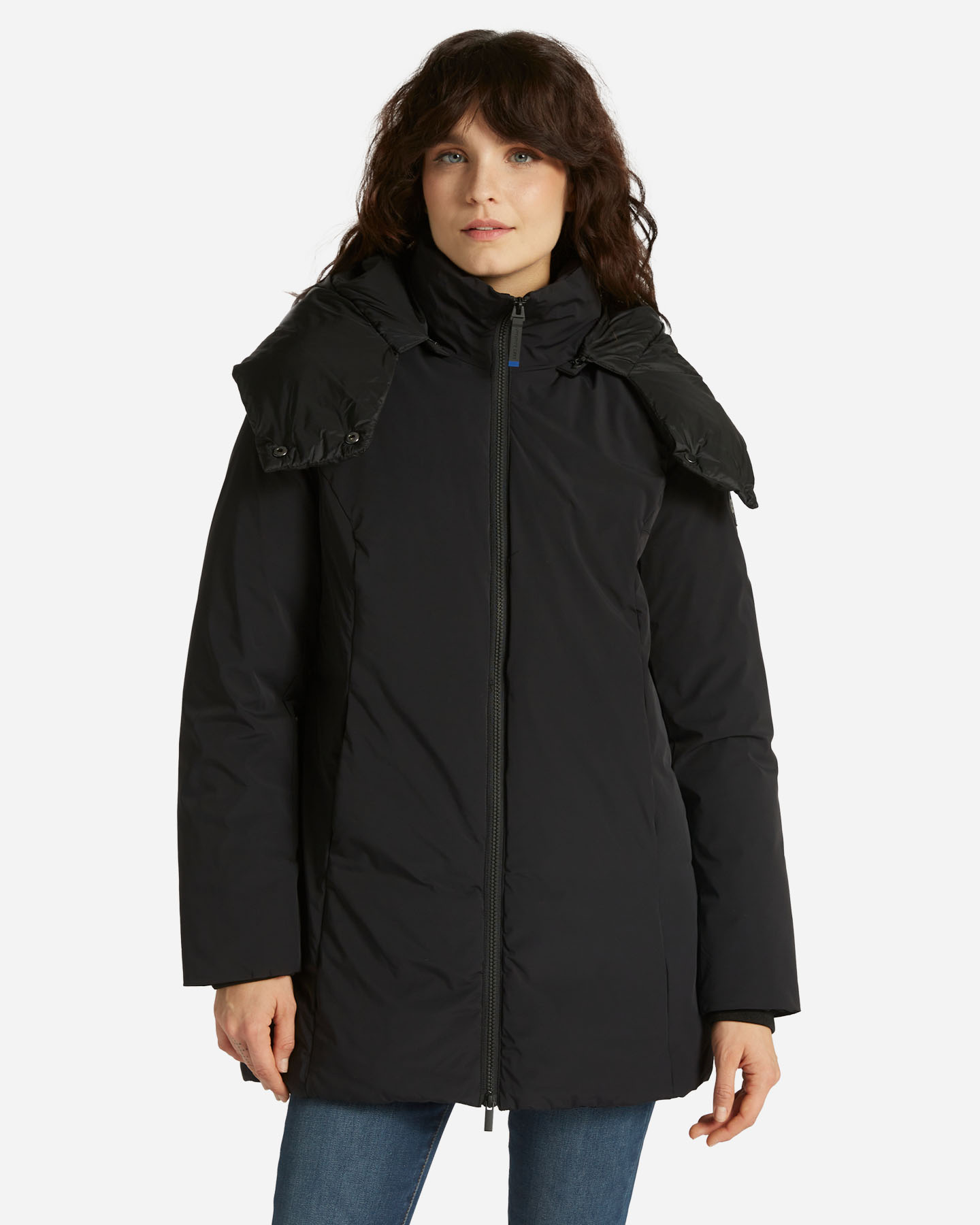 Giubbotto lungo con cappuccio, liscio sulla parte frontale e trapuntanto nella parte posteriore. Il capo è realizzato con un tessuto stretch creando maggior agio e agevolando i movimenti.