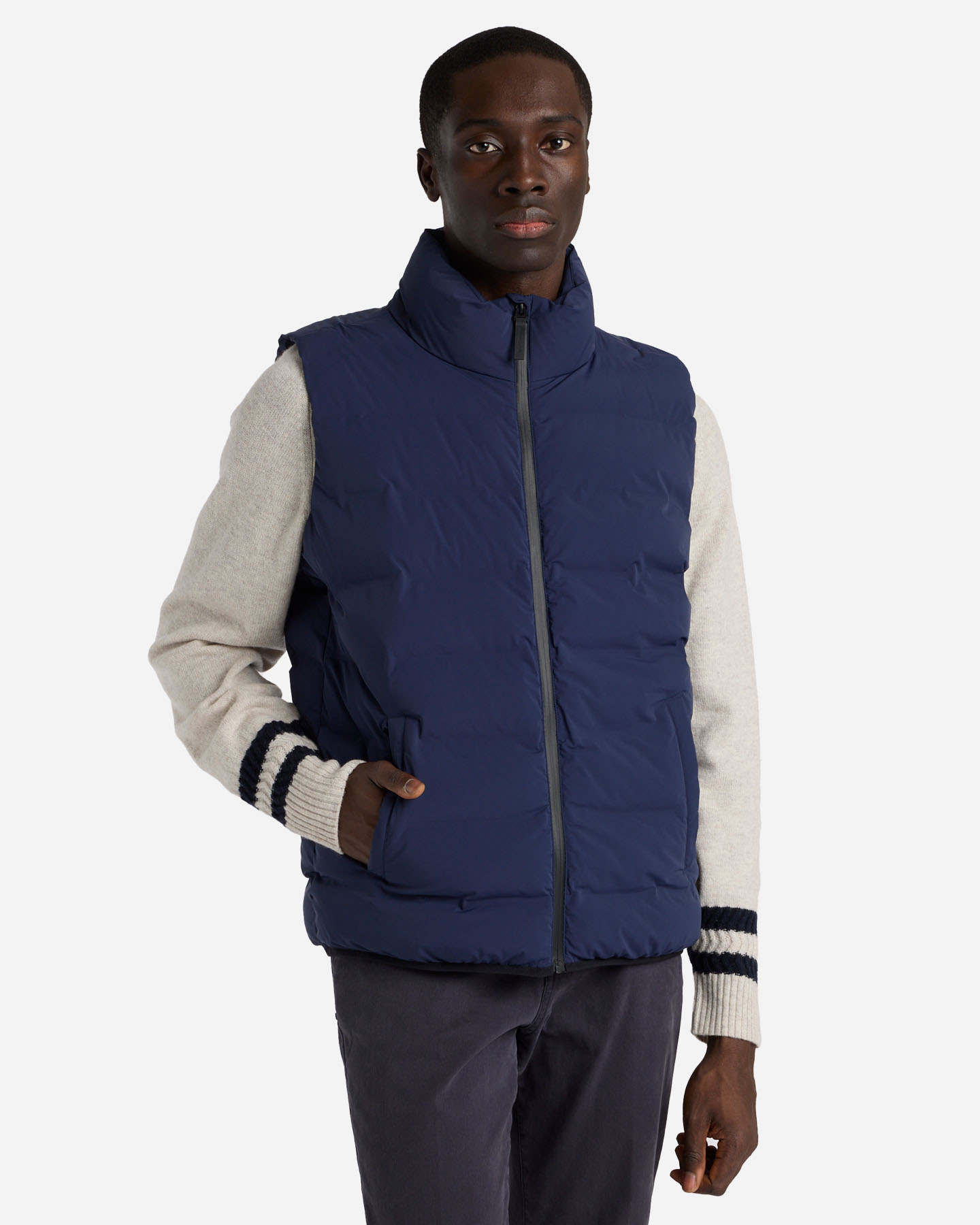 Questo gilet con trapuntatura orizzontale è realizzato con un tessuto stretch e trapunte termosaldate. Nonostante la sua imbottitura avvolgente, riesce a mantenere comunque la leggerezza. All'interno presenta delle tasche realizzate tessuto in pile che conferisce comfort e calore.