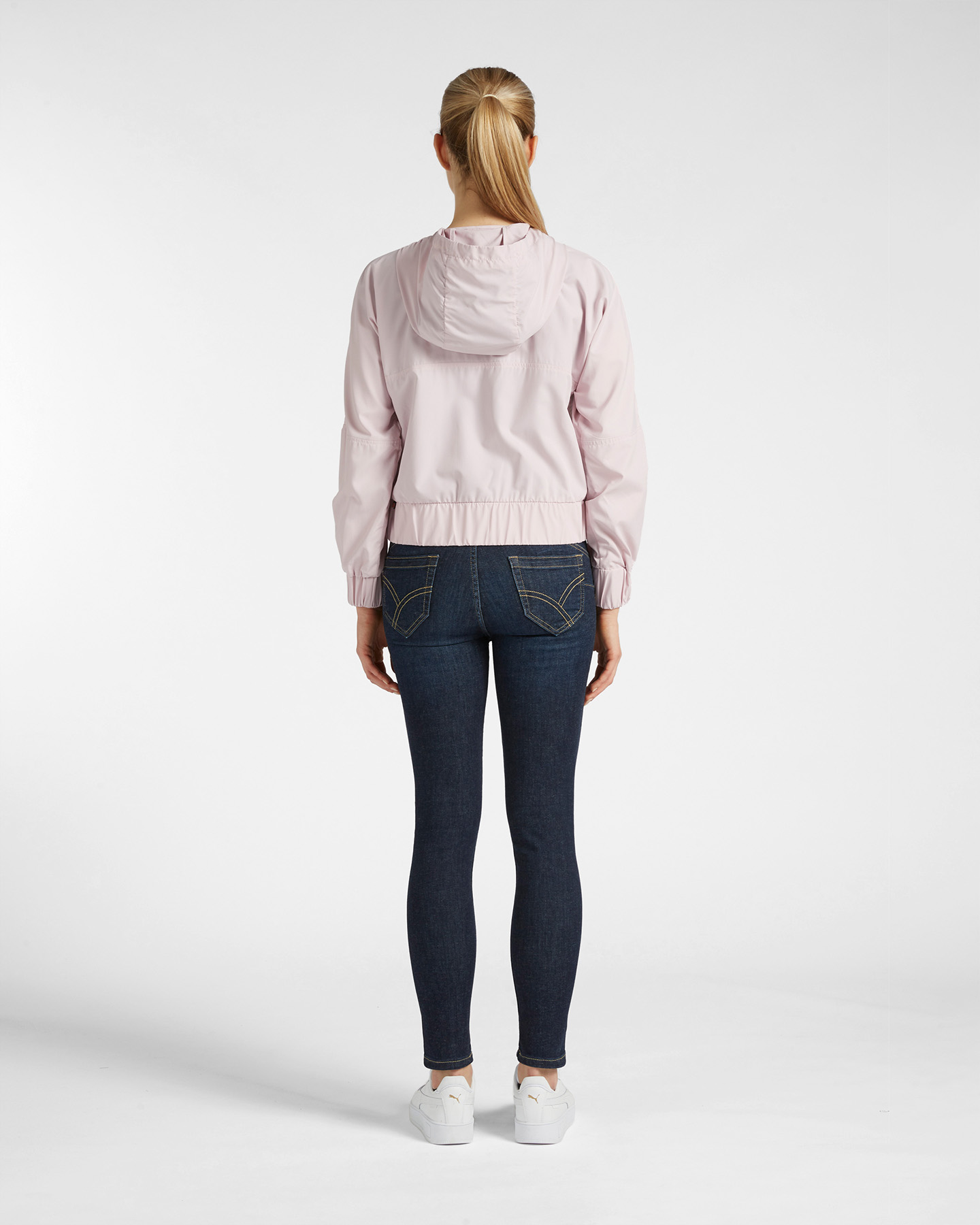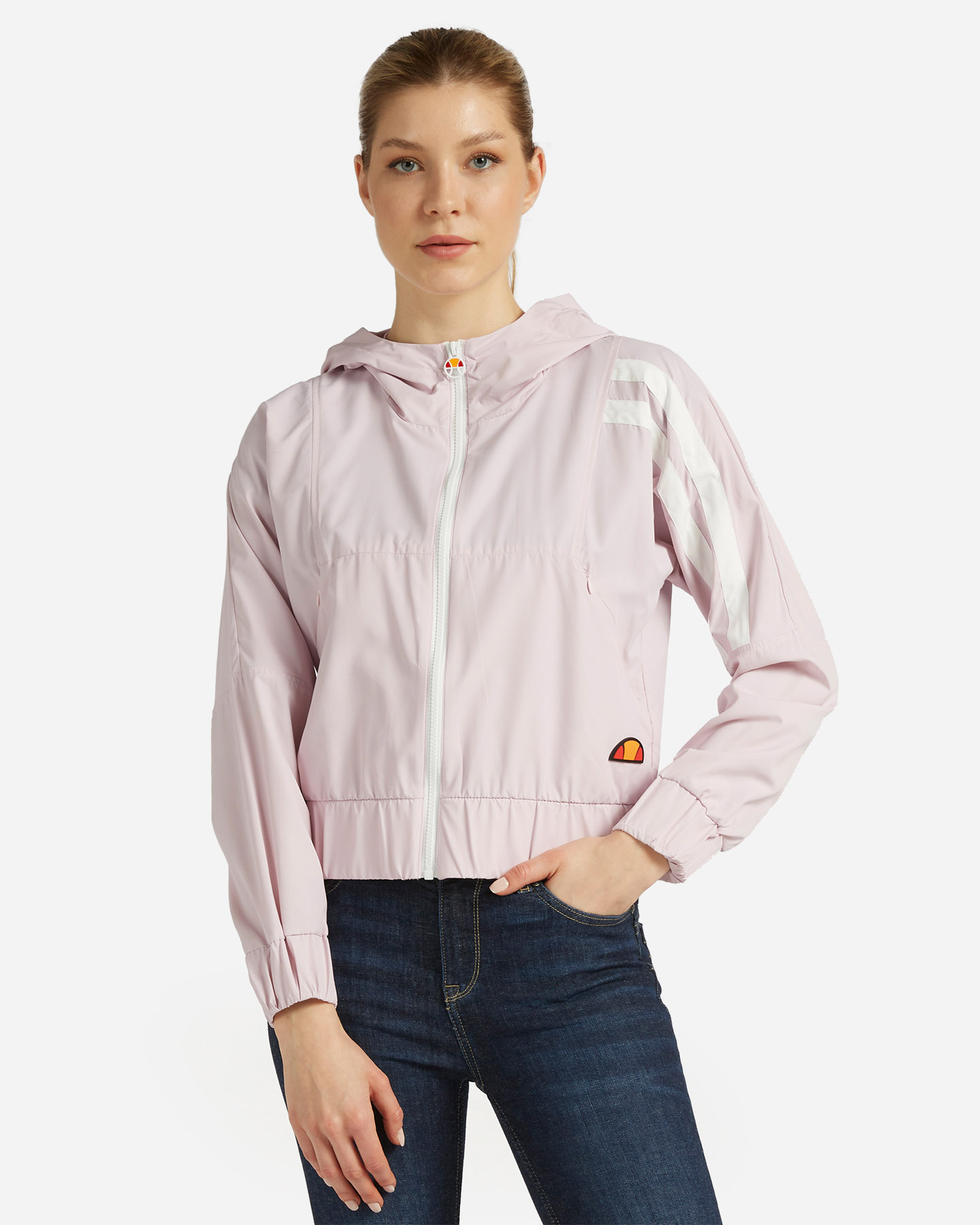 Giacca corta full zip con cappuccio con tape applicati.