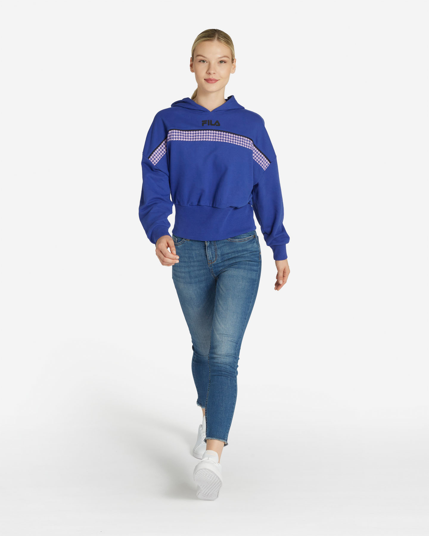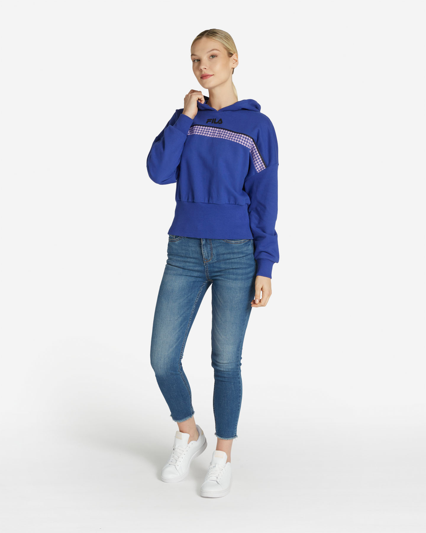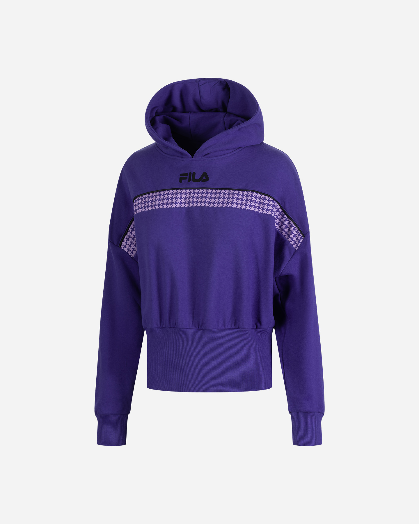 Felpa con cappuccio in misto cotone con trattamento peach touch che dona al tessuto una mano soffice e vellutata. Inserto pied de poule a contrasto che dona un tocco femminile e accattivante.