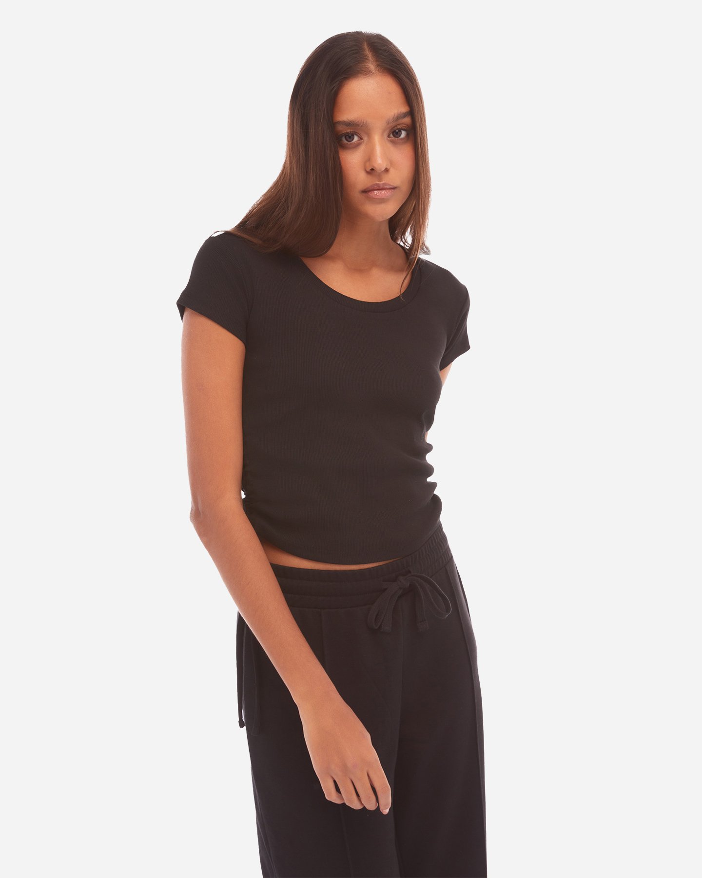Questa t-shirt con lavorazione a costina ha delle coulisse sui fianchi che consentono di regolare la lunghezza e rendono dinamico e attuale il design.