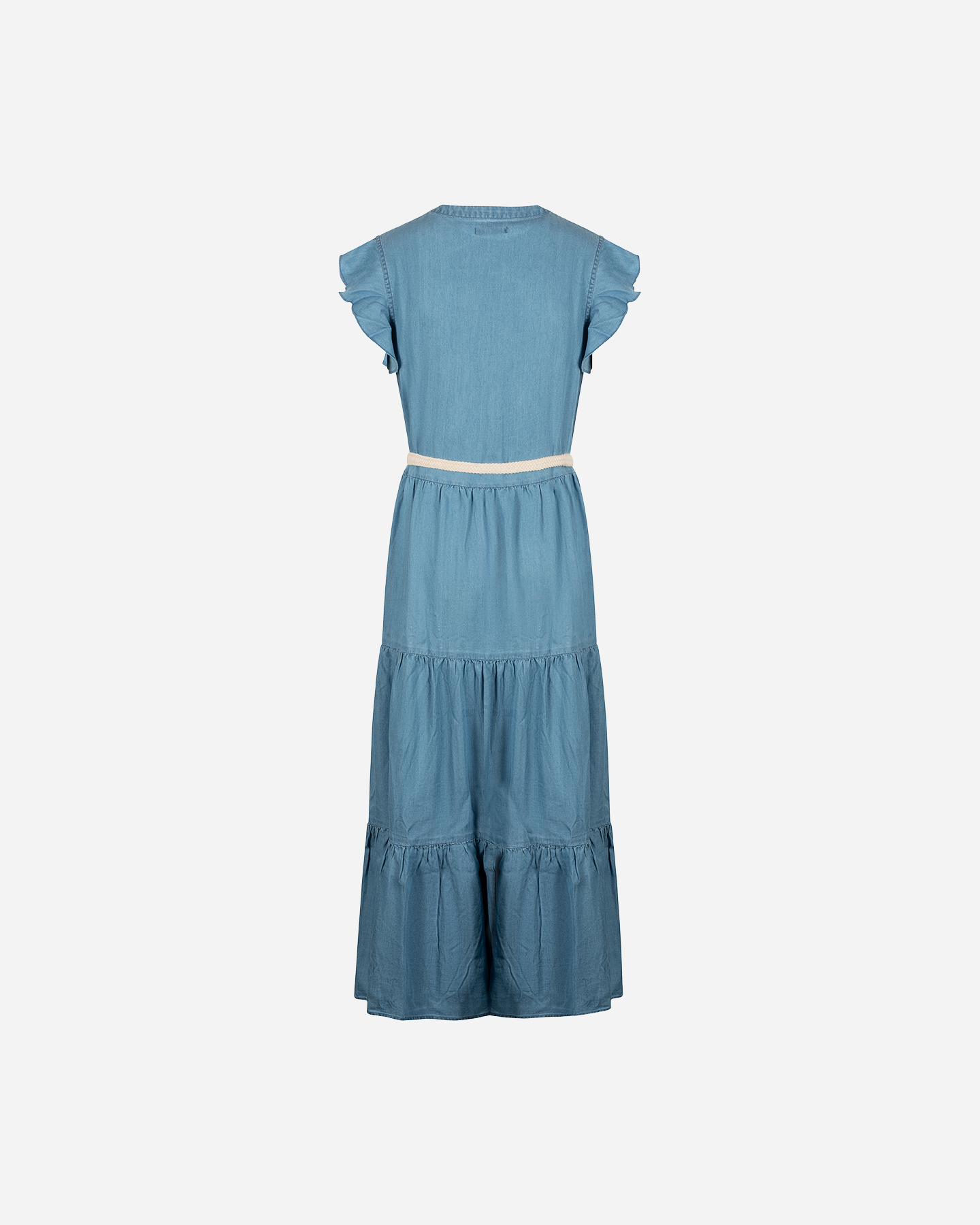 Questo abito chemisier lungo è realizzato in denim tencel con balze, volant e cintura in vita, per un look fresco e leggero adatto a ogni occasione.