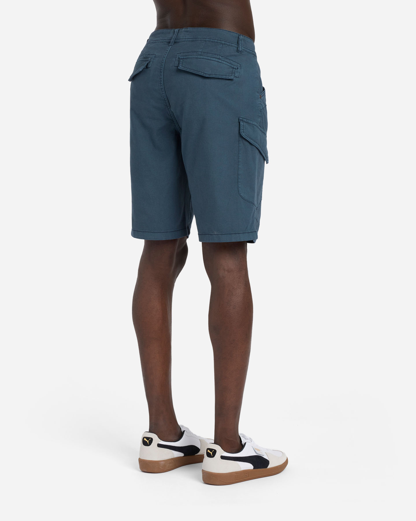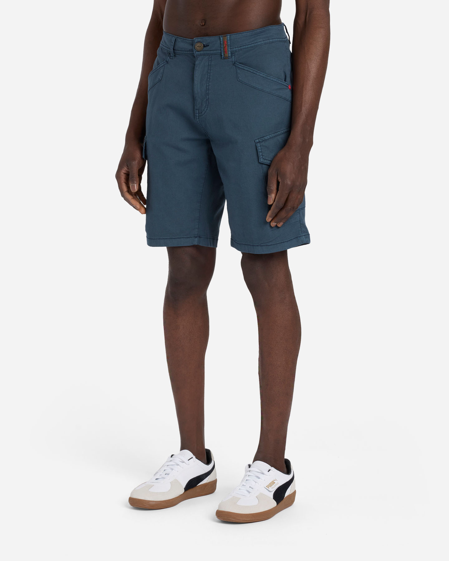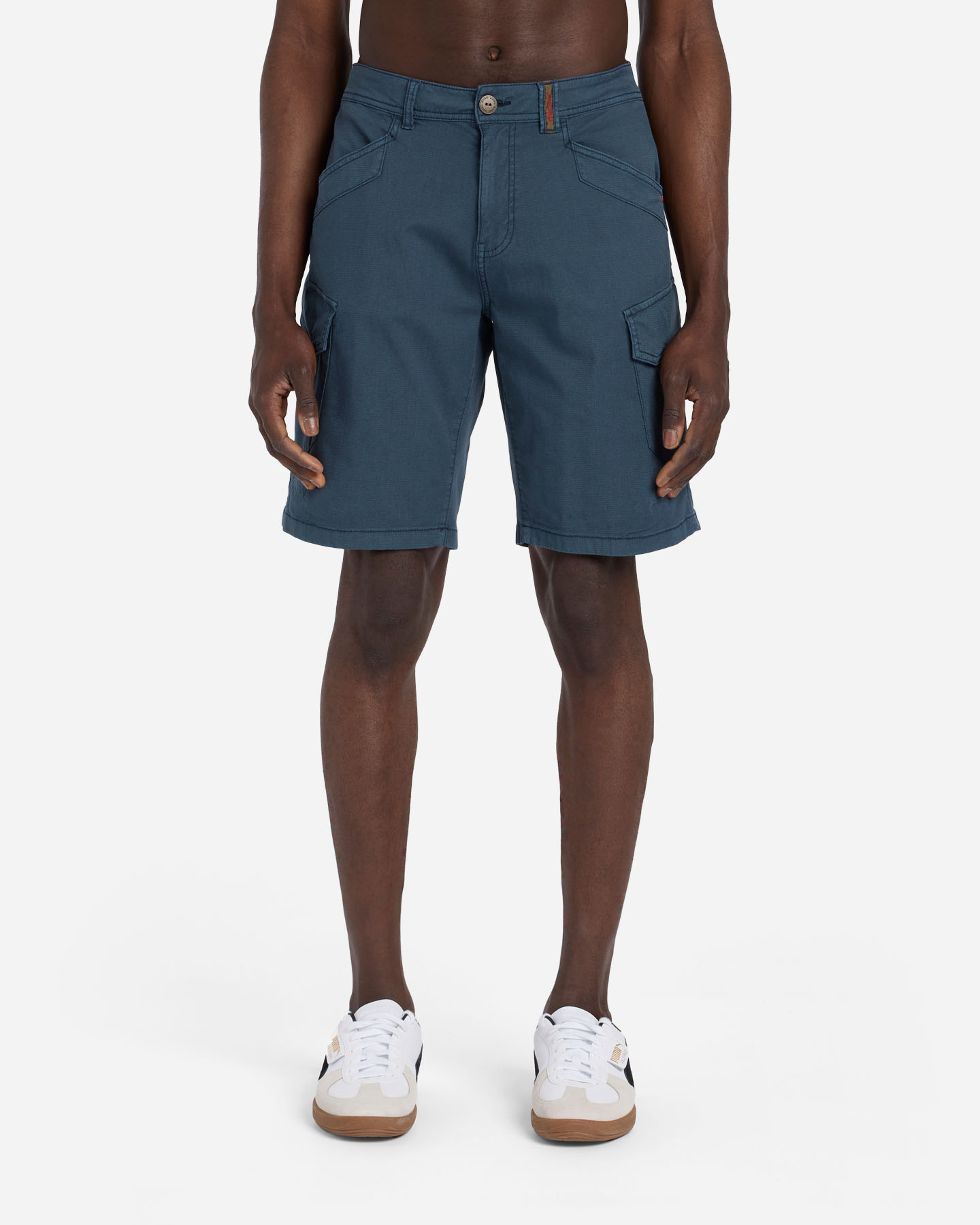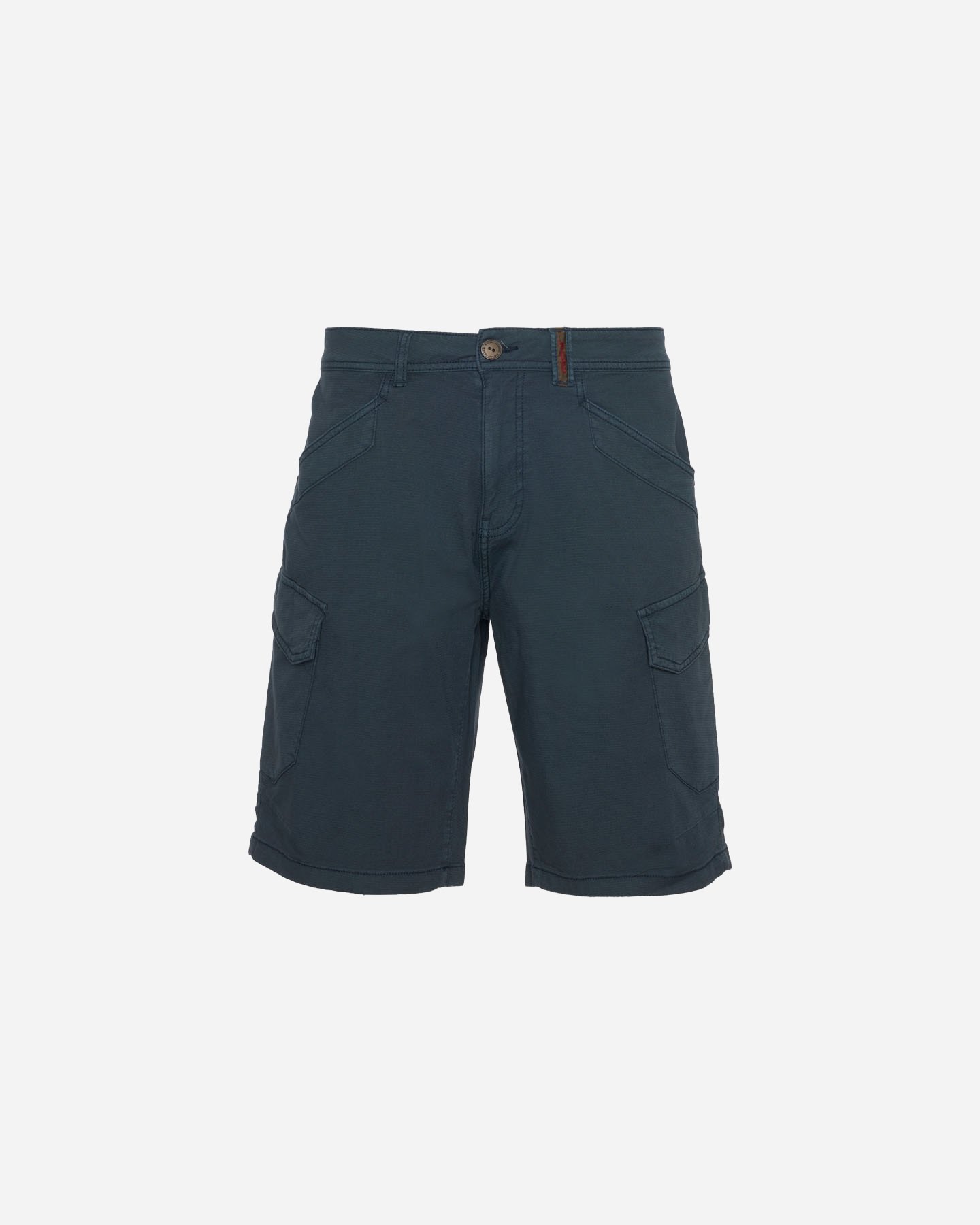 Questo bermuda cargo realizzato in cotone rib- stop leggero elasticizzato, presenta una chiusura frontale con cerniera e bottone. Le tasche frontali e il dettaglio di tasche posteriori con patta risultano pratiche per portare con sè gli oggetti indispensabili.