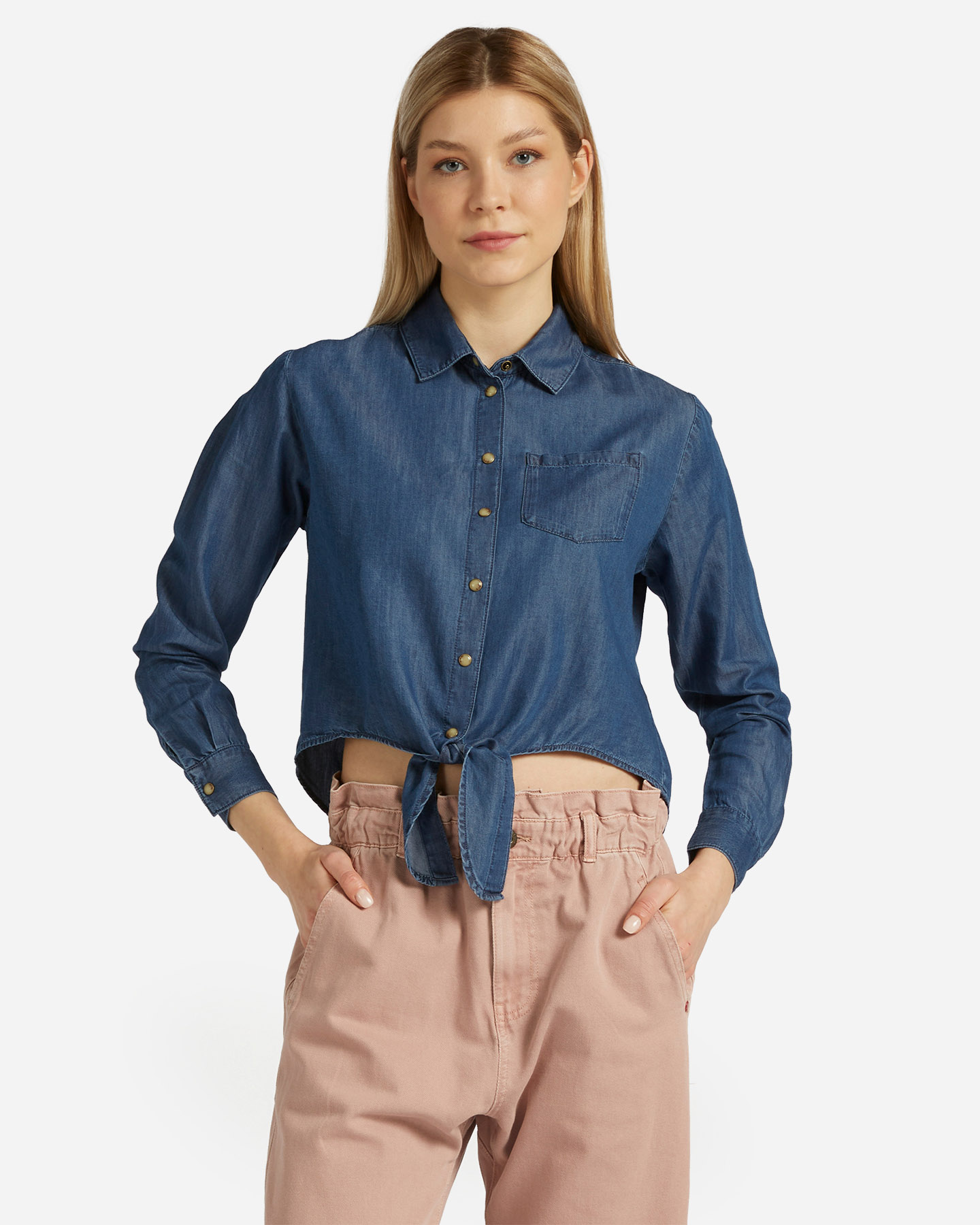 Camicia in morbido denim e tencel, chiusura con bottoncini automatici e dettaglio nodo sul fronte che dona un tocco trendy ad ogni outfit!