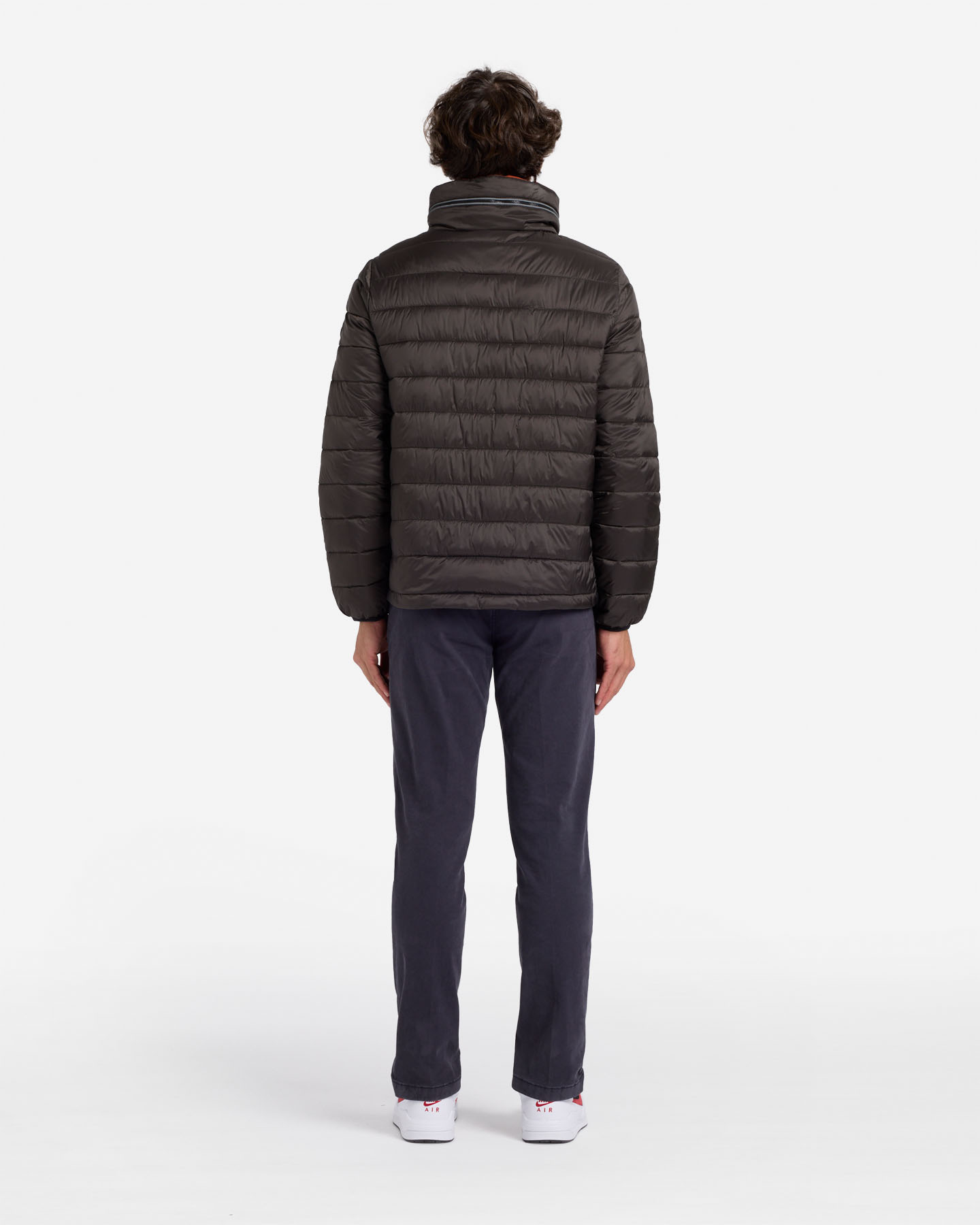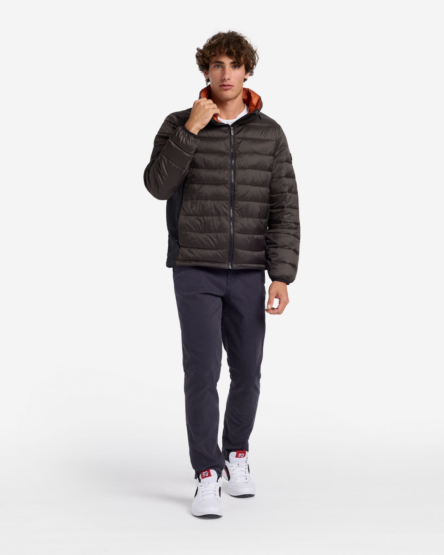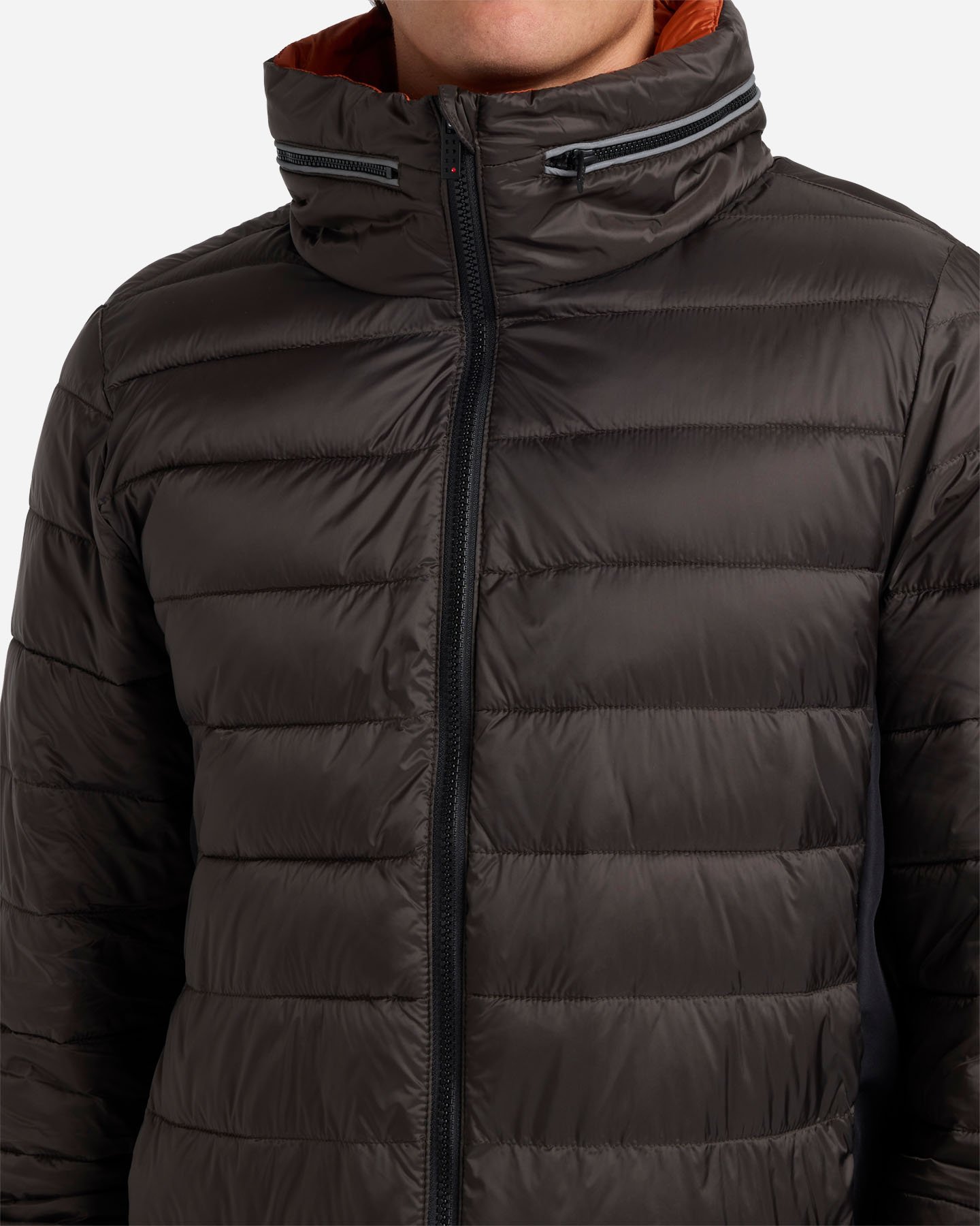 Giubbino con imbottitura ultraleggera, realizzato in due tessuti. Collo alto con zip bordata da piping catarifrangente, cappuccio di servizio che si ripiega al suo interno. Vestibilità ergonomica e confortevole grazie ai fianchetti laterali che agevolano i movimenti. Apertura centrale, tasche laterali rivestite in pile per tenere le mani al caldo con chiusura a zip. Elasticatura interna al fondo e polsi per mantenere maggiore isolamento.