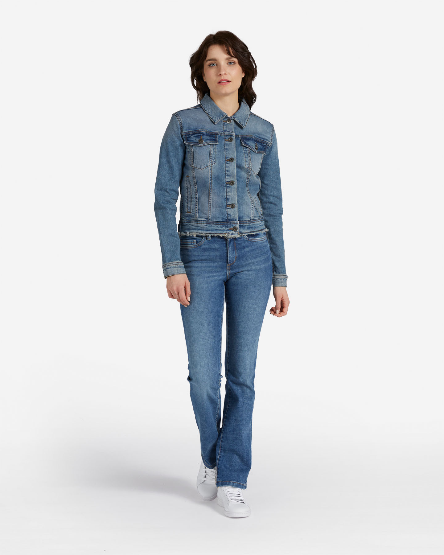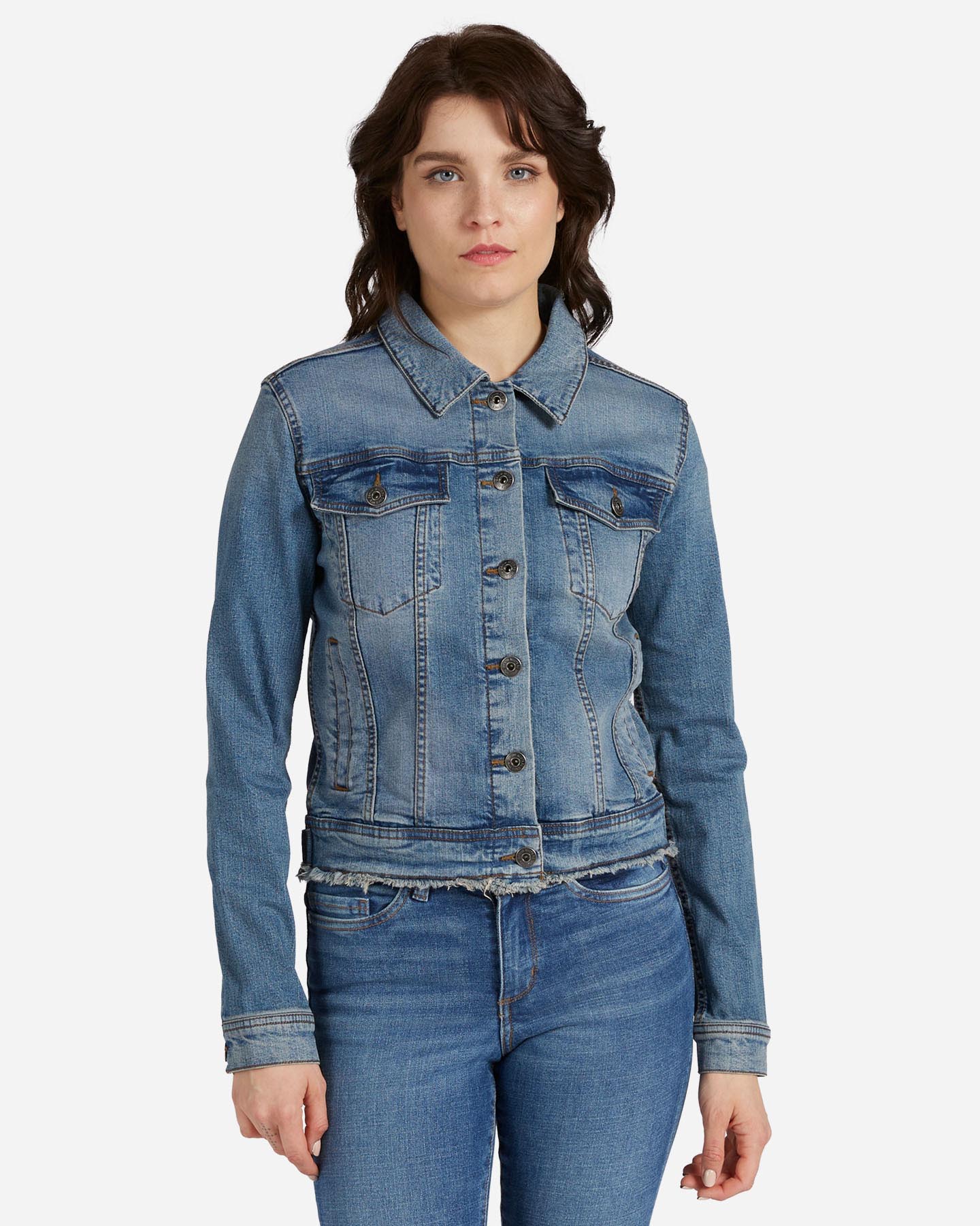 Questa giacca realizzata in denim elasticizzato, presenta un fondo sfrangiato che conferisce un aspetto grintoso e un dettaglio originale al capo, per un look unico.
