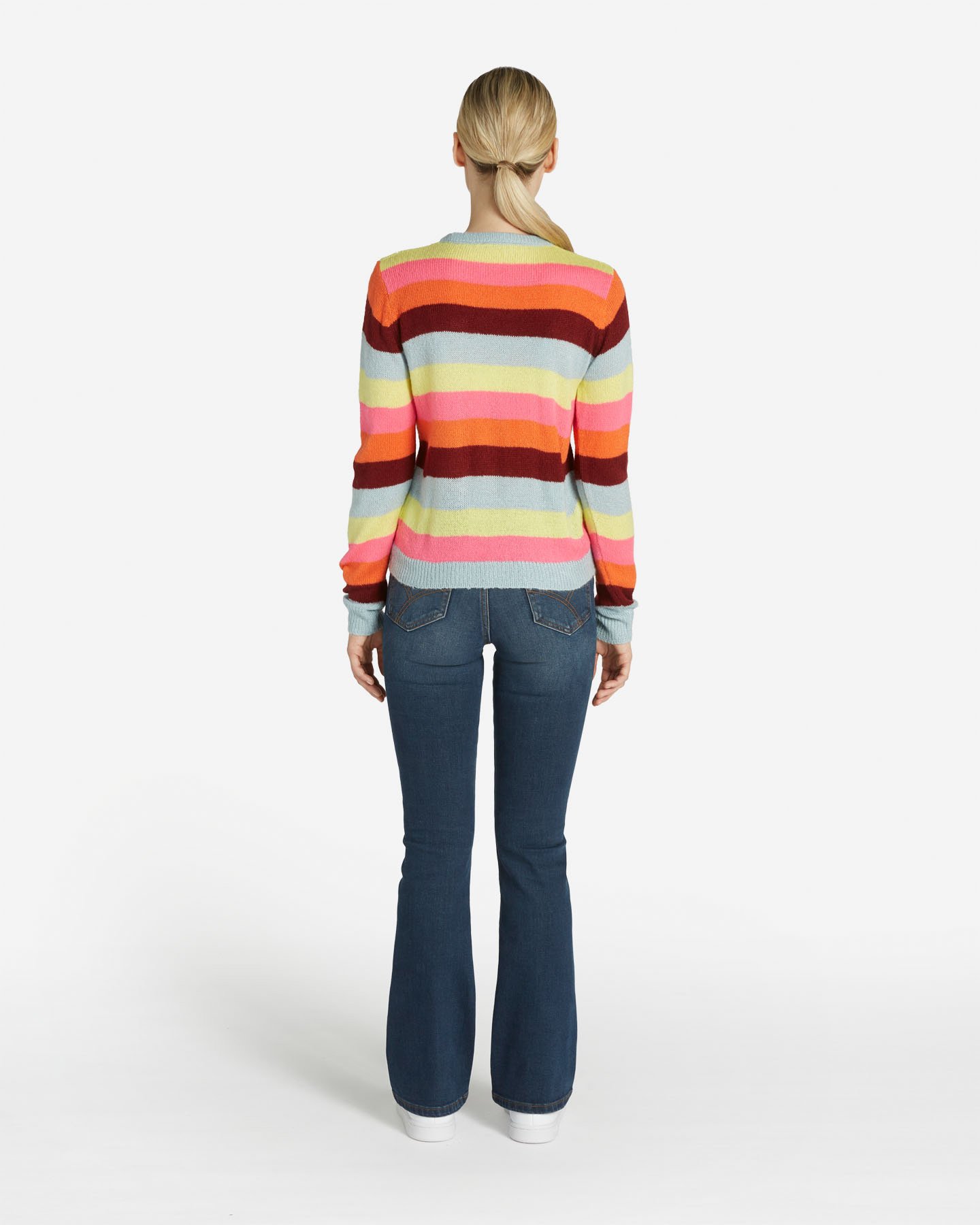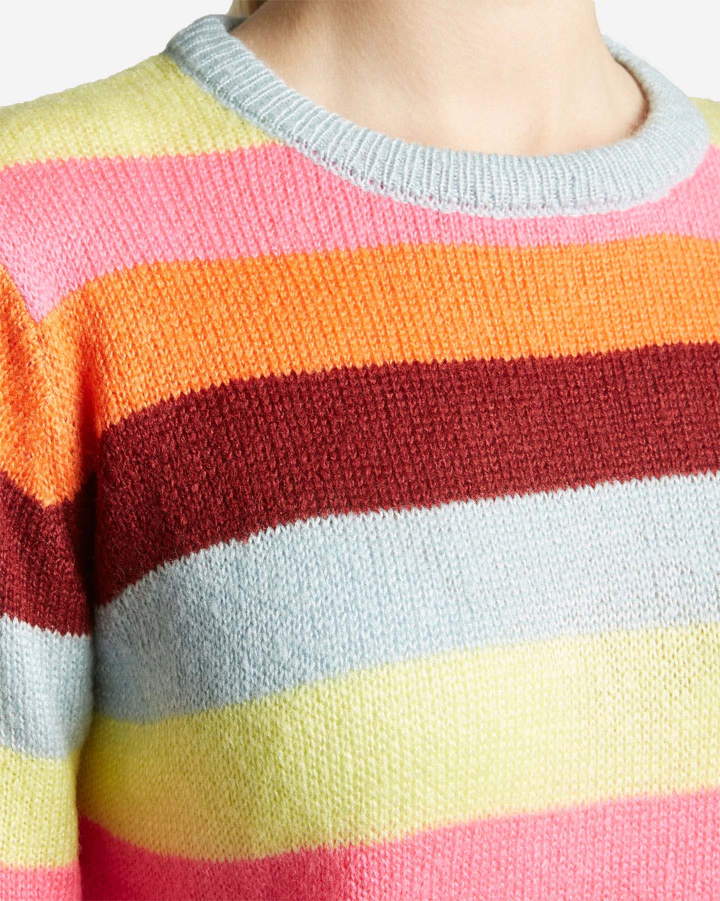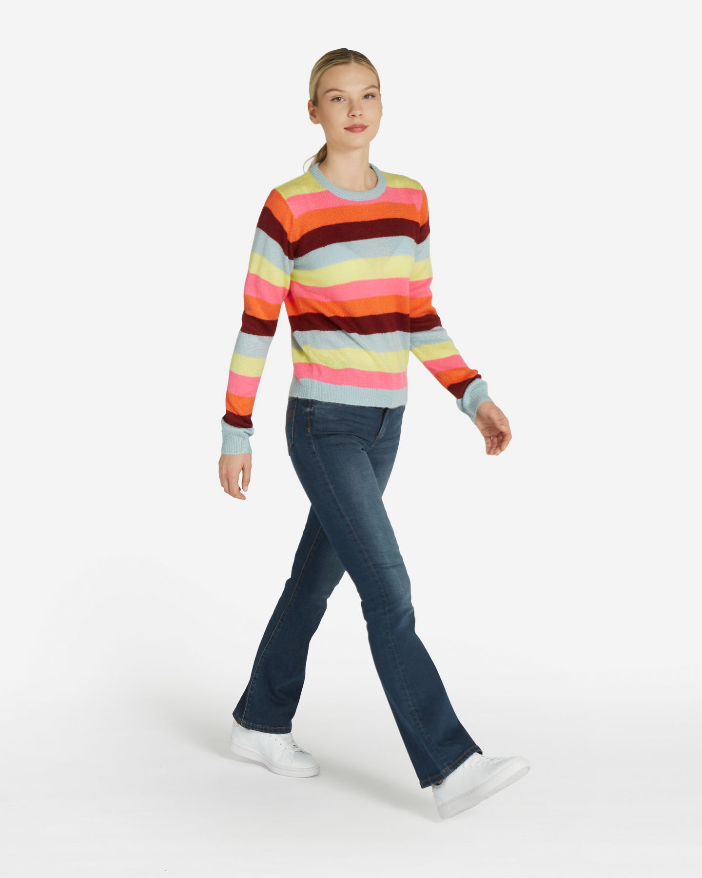 Energetico e vibrante, il maglioncino girocollo rigato si accende con il colore: le nuances contrastanti, illuminano il tuo stile dal giorno alla sera.