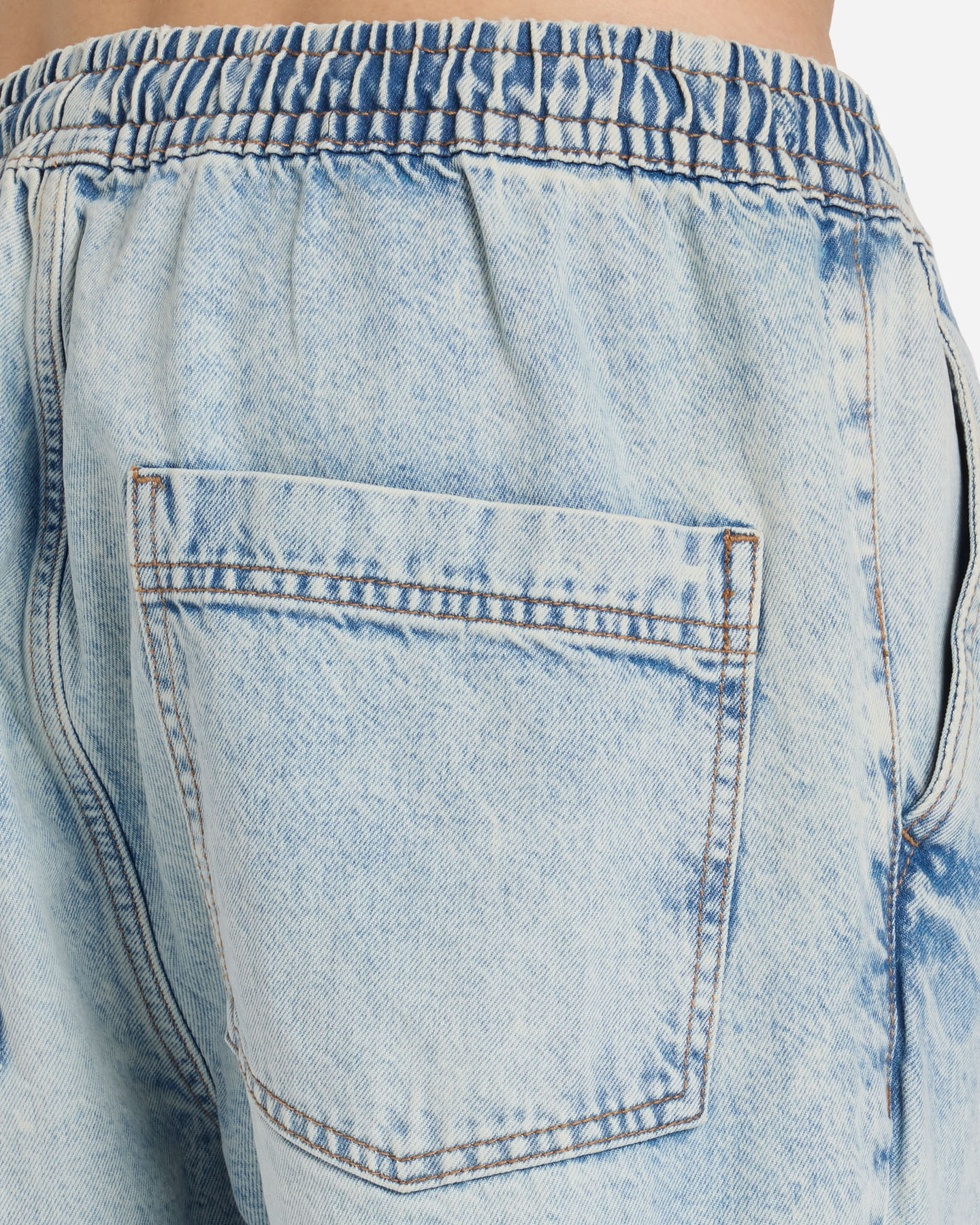 Questo pantalone jogger denim presenta una chiusura con coulisse in vita elasticata, tasche frontali diagonali, e tasche posteriori per potare con sè gli oggetti personali e un orlo elasticato al fondo.