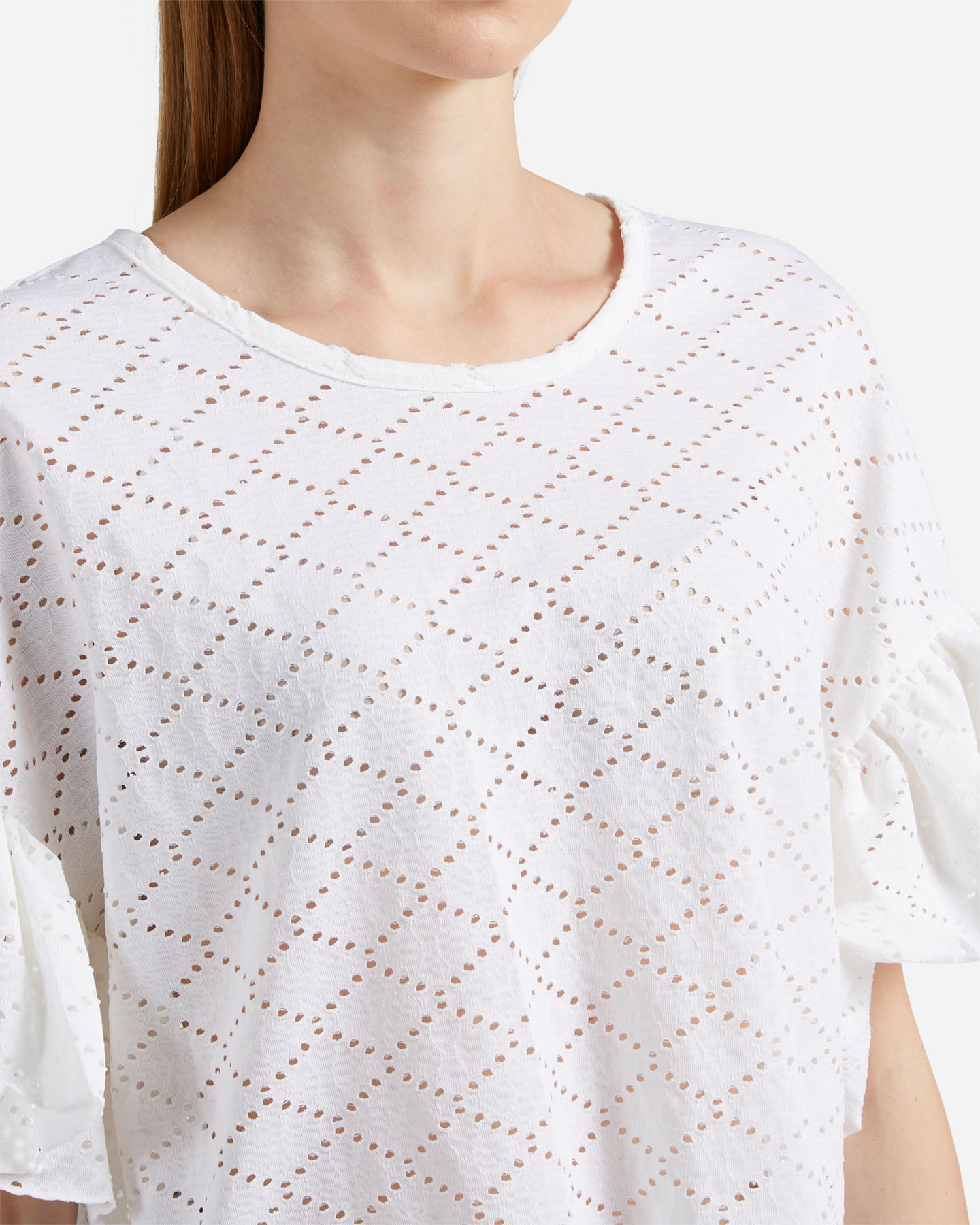 Questa t-shirt traforata realizzata in jersey elasticizzato, presenta un'effetto pizzo San Gallo, con disegno geometrico d'ispirazione etnica e volant sul fondo manica, per uno stile unico.