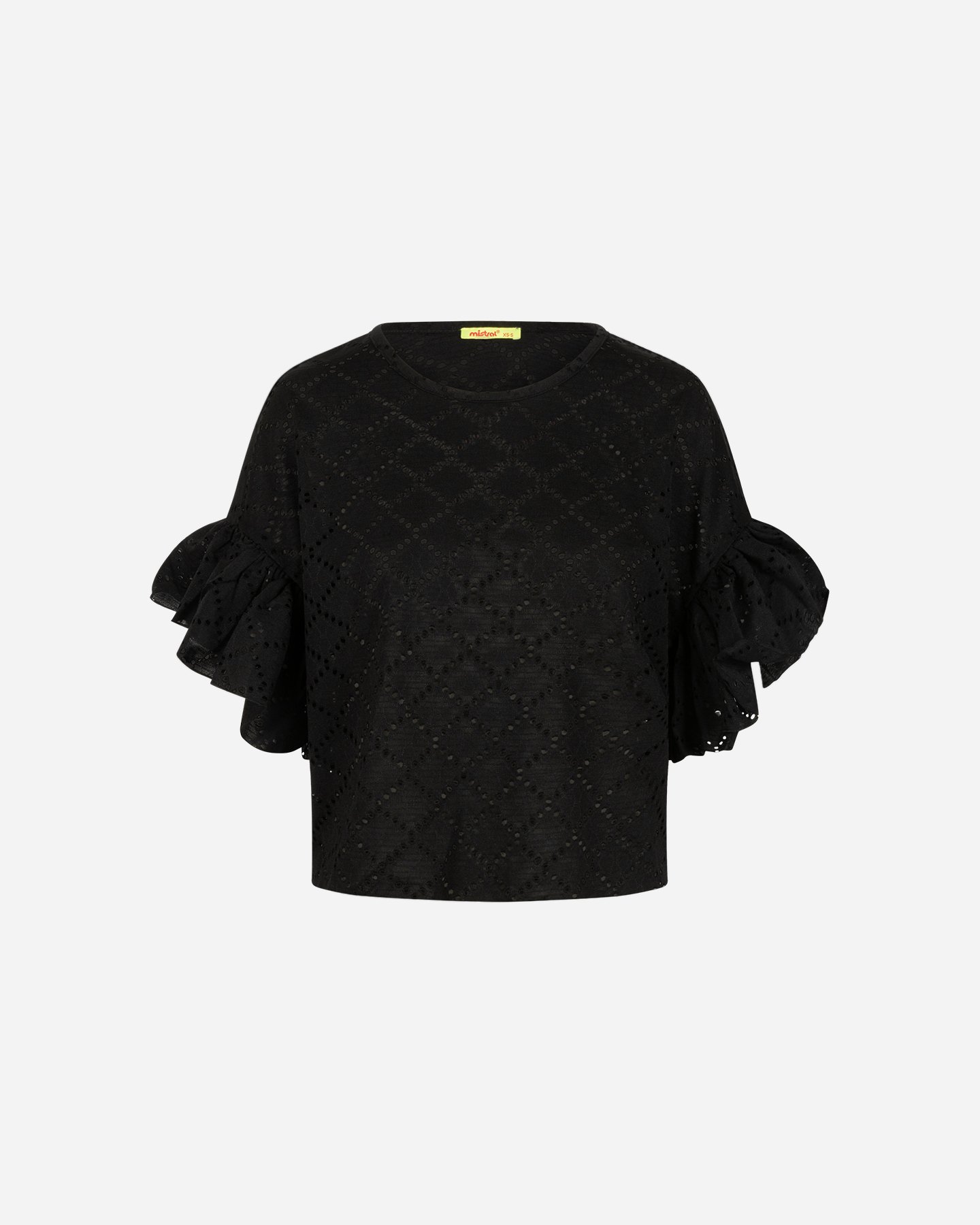 Questa t-shirt traforata realizzata in jersey elasticizzato, presenta un'effetto pizzo San Gallo, con disegno geometrico d'ispirazione etnica e volant sul fondo manica, per uno stile unico.