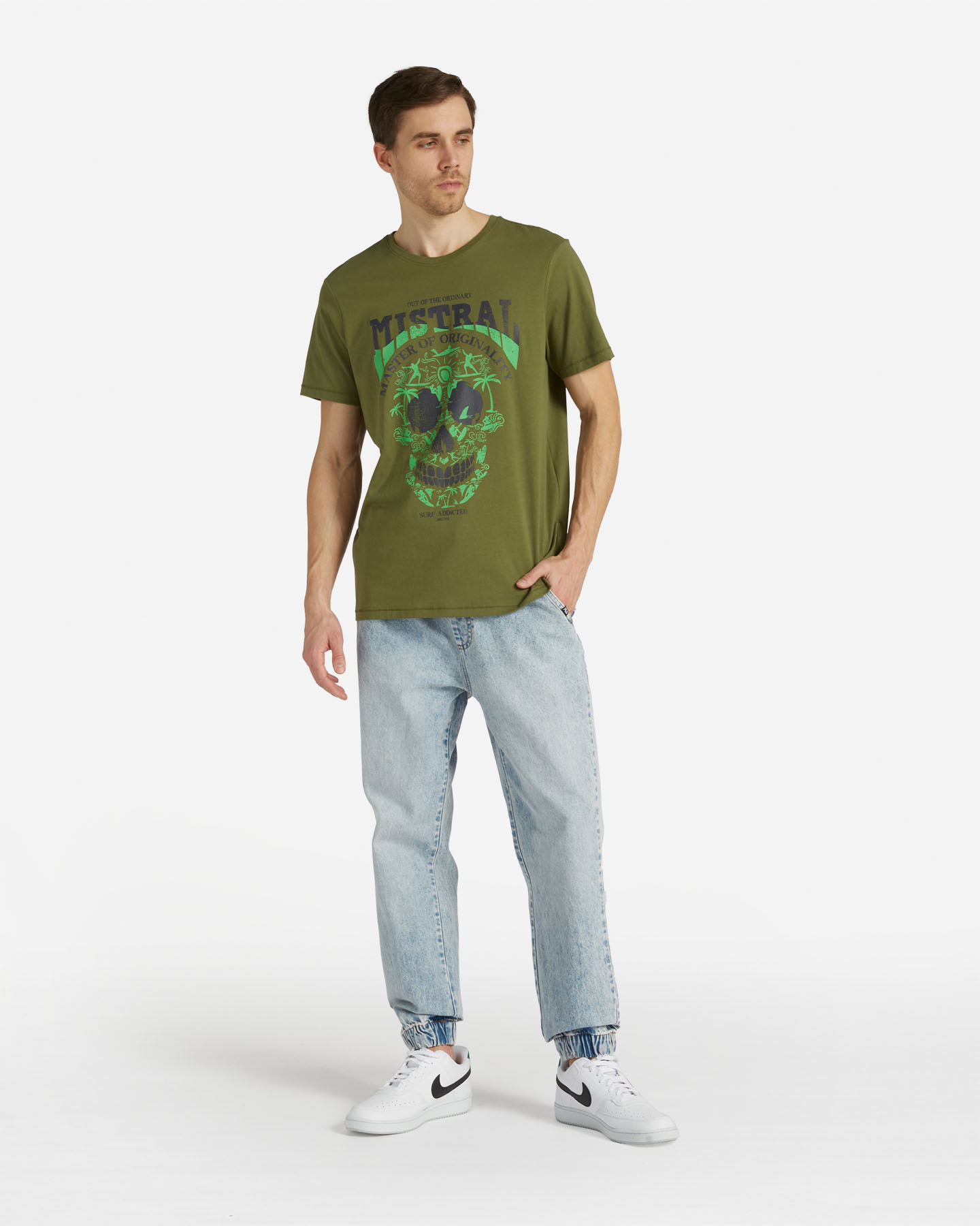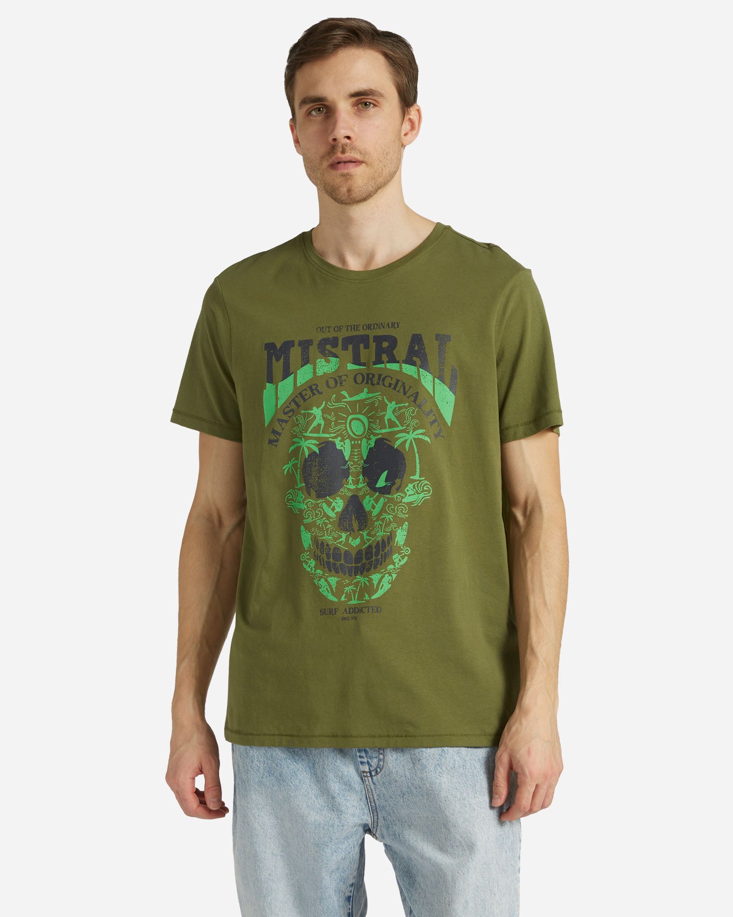 Lo stile Mistral trae ispirazione dalla fusione di culture diverse. Questa t-shirt con grafismi che richiamano il mare, il surf, il sole compongono l'immagine di un teschio. Il risultato è di un design intramontabile dal tocco rock and roll e surfer addicted. Una dichiarazione di stile audace e originale!