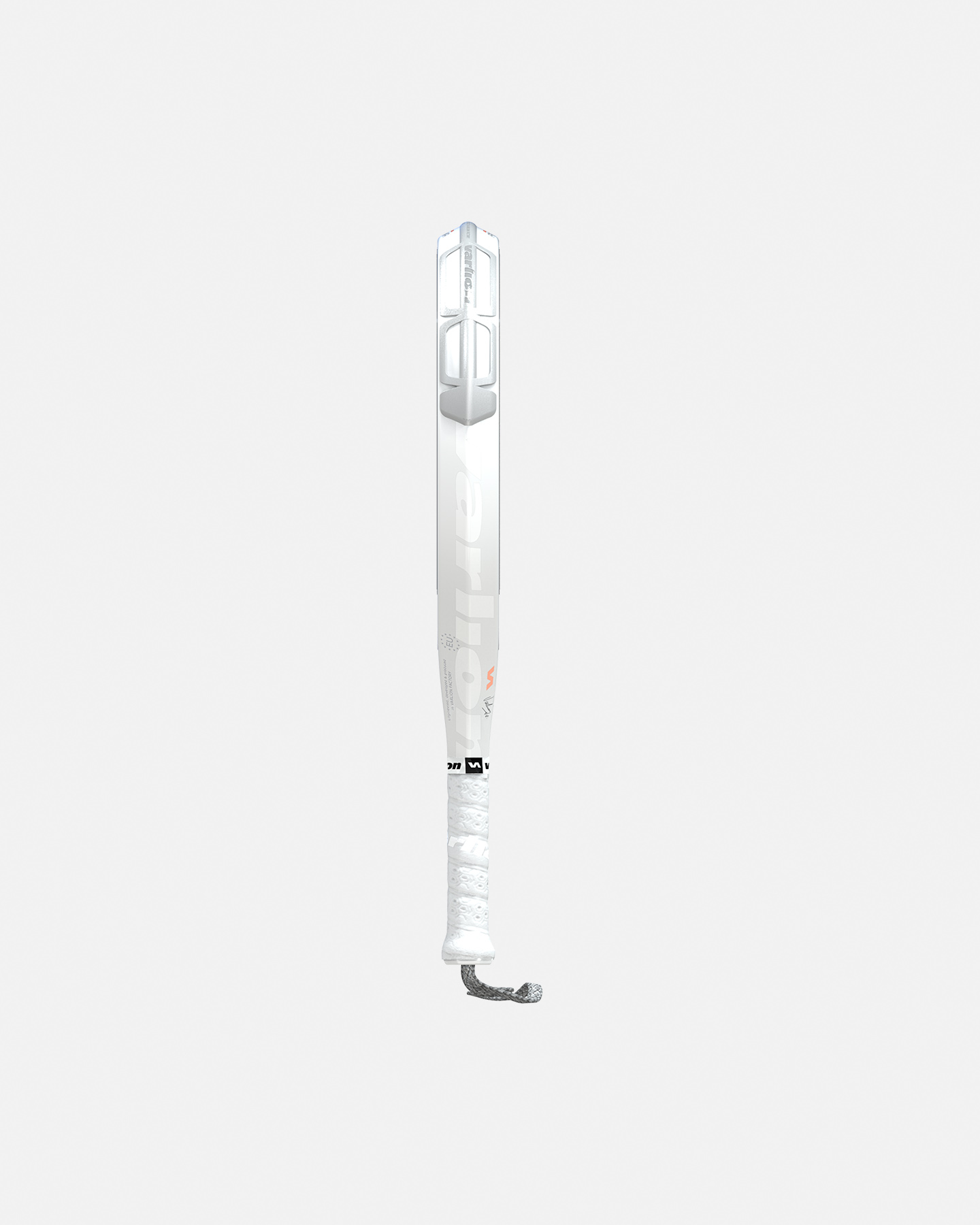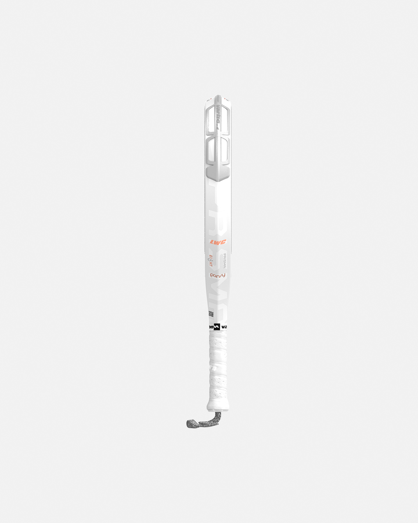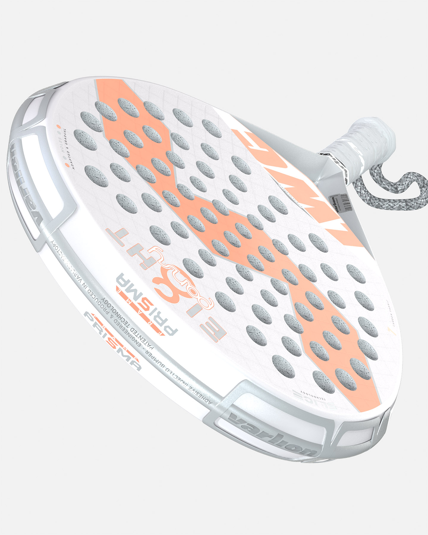 La racchetta da padel Varlion con una forma rotonda che favorisce il controllo della potenza. È prodotta utilizzando un tubolare in carbonio bidirezionale. Il suo nucleo è realizzato in gomma Eva Hypersoft da 38 mm di durezza media, ed è laminato da strati di tessuto di carbonio e fibra di vetro. La zona del cuore è inoltre rinforzata con tessuti in fibra di carbonio impregnati con resina epossidica VAR- FLEX esclusiva Varlion per ottenere la massima elasticità e resistenza, e ricoperta da uno strato di biossido di titanio. Presenta l'incorporazione del telaio Prisma, che offre una maggiore accelerazione e velocità di movimento grazie al suo design aerodinamico, e include anche una protezione adesiva iniettata, prodotta mediante uno stampo ad iniezione in TPU a bassa durezza, per assorbire urti e graffi. Si fissa sul telaio della racchetta mediante un materiale adesivo senza la necessità di forare il telaio, fungedo da antivibrante.